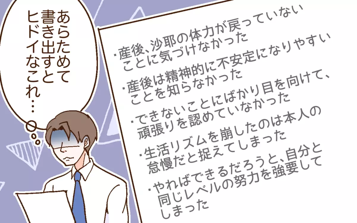 そんなある日、妻が置き手紙を残して実家へ。夫はすぐに妻のもとを訪ねるが、「帰ってください」と突き放される。さらに妻の母から「産後うつになる可能性もあった」と言われ、初めて自分の過ちに気づいて…。
