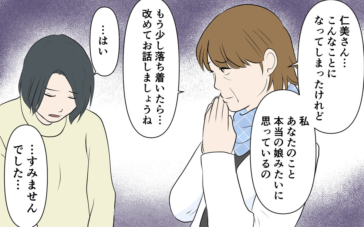 しかしその夜、夫から「母さん、泣いてたよ」と言われ、仁美は泣きながら今日あったことを話したのだが、夫からは「本当に母さんだけが悪いのかな」などと言われてしまい…。
