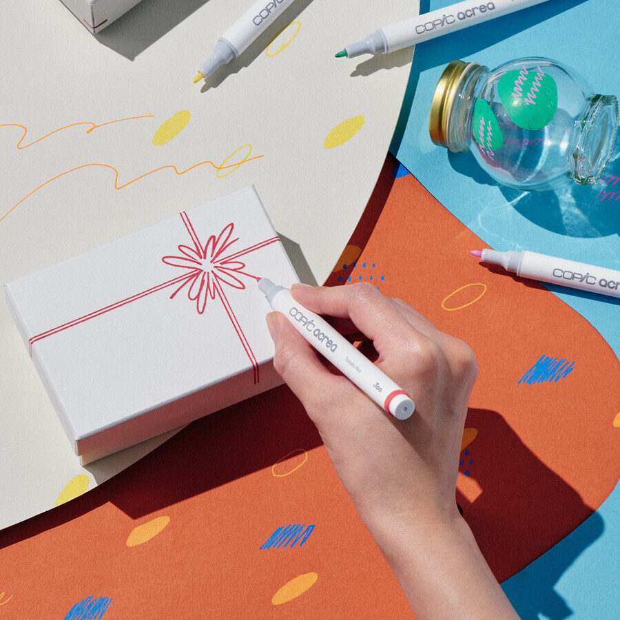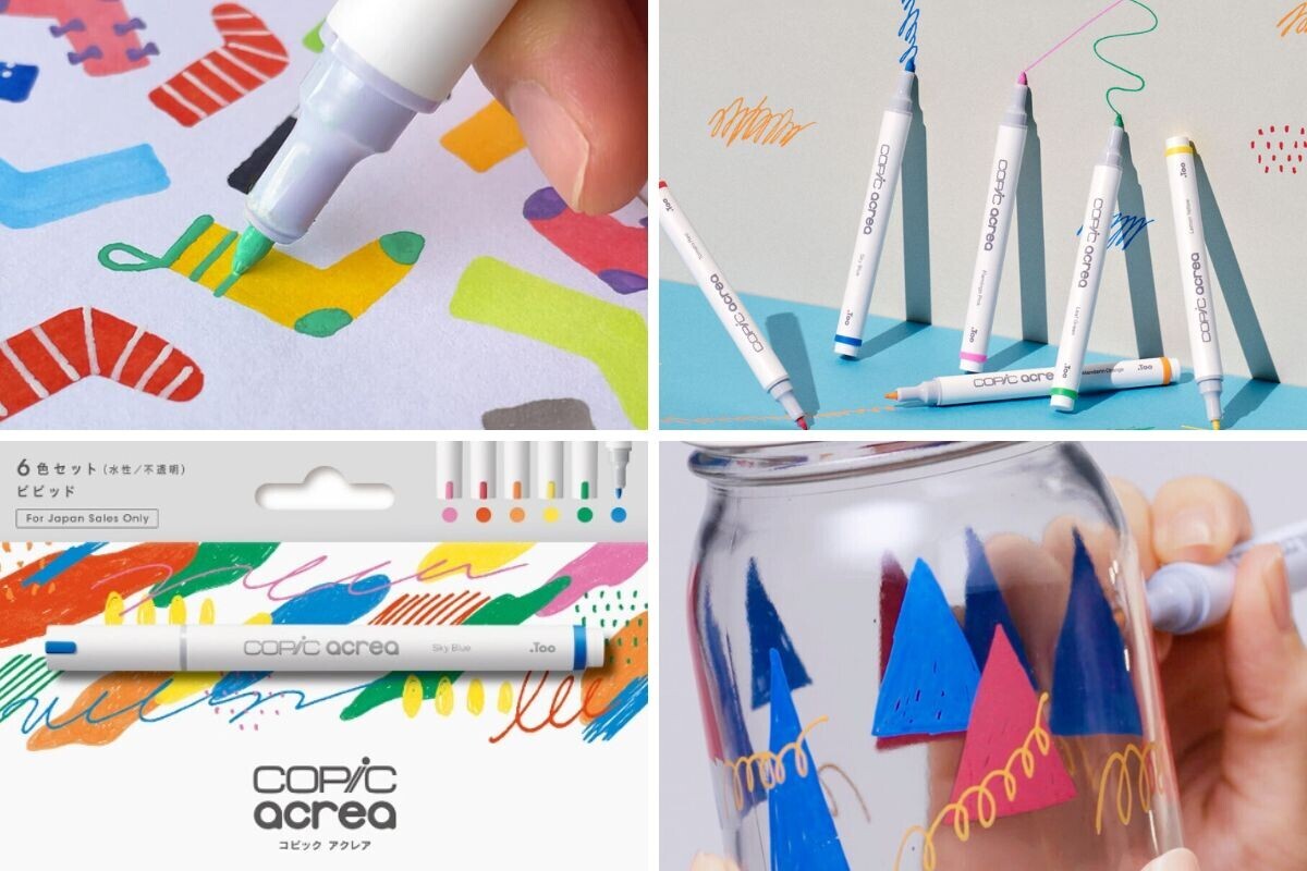 「コピック アクレア」は、紙以外のあらゆる素材に描くことができる水性顔料インクのカラーマーカー。
