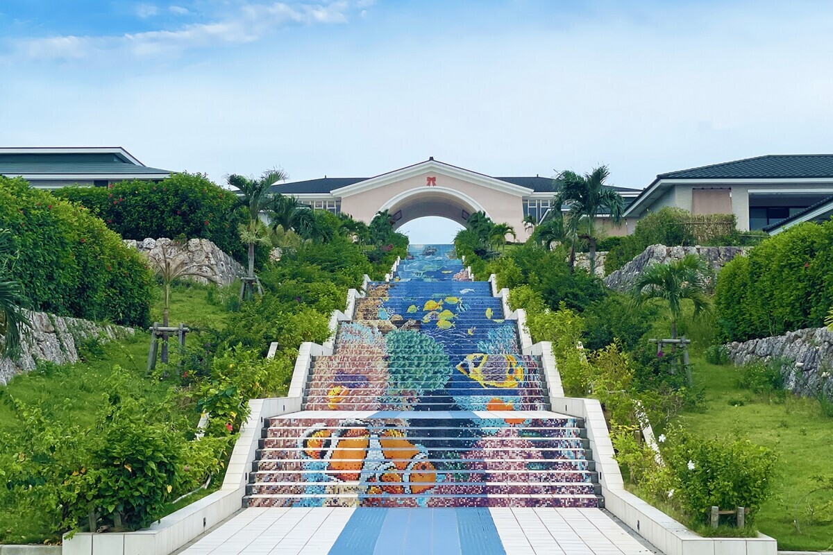 海まで降りていけそうな階段には、かわいらしい魚のモザイクアートが!