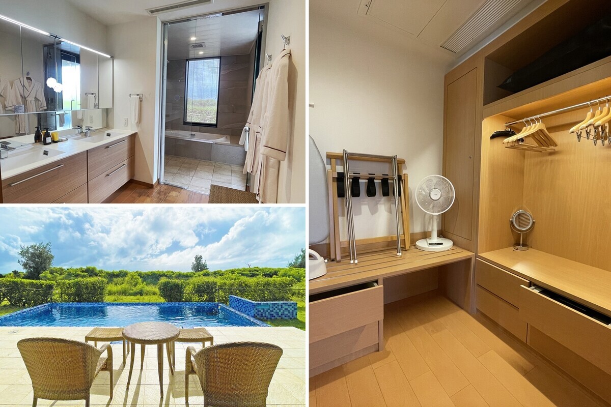 ホテルを運営しているのは、住宅メーカーの飯田産業。「住みたい、暮らしたいと思ってもらいたい」という思いで設計されているとあって、水回りなどもストレスフリー。プールとシャワールームは直接行き来ができます。