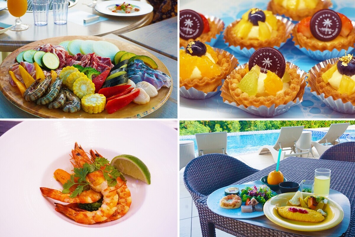 上左/BBQの食材でイチオシは、泡盛の酒粕をエサに食べて育った牛「宮古島泡盛ほろよい牛」。脂の甘さと赤身の旨味が絶妙。レアで食べるのがおすすめ。上右/ブッフェのスイーツ。下左/料理の一例「宮古産車エビのポワレ」。下右/朝食ブッフェではしぼりたてのグレープフルーツジュースが人気