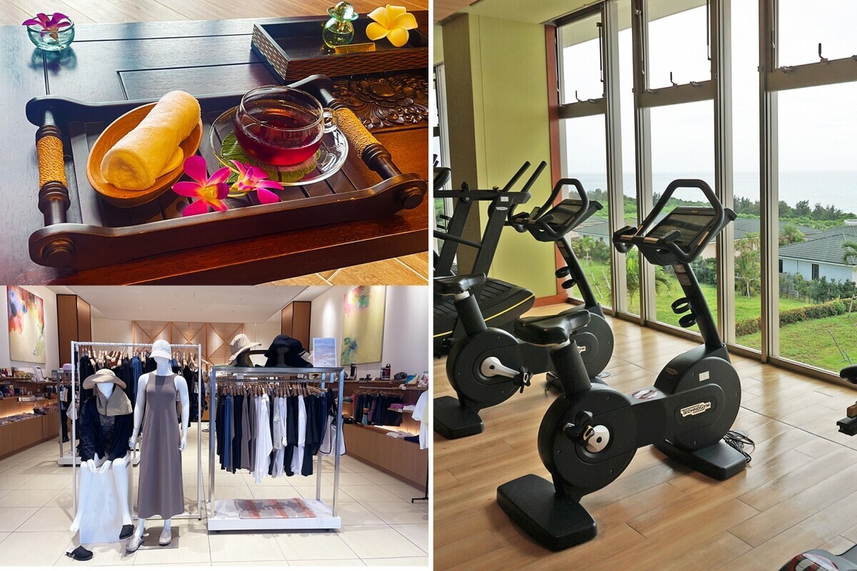 左上/オイルを使ったトリートメントで香りにも癒やされるスパ。左下/品ぞろえがおしゃれなブティック。オリジナルサンダルやジーンズも人気。右/有酸素マシンと筋トレマシンを備えたフィットネスジム