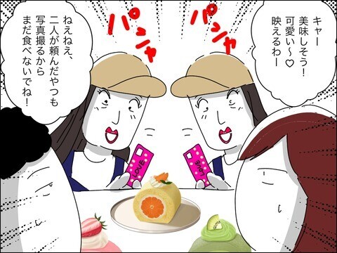 ケーキ屋さんでドレミさんは映える写真の撮影に夢中になります。でも1時間も並んだうえケーキを目の前にお預けを食らった子どもはイライラ。ドレミさんに「オバちゃん早くして」と声をかけます。