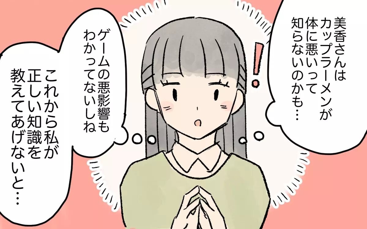 綾子は美香の育児がガサツに見えて苦手に思っていました。寒い日に上着を着せない、夜9時からゲームをしたり、夜ご飯にカップラーメン…。綾子は美香を正そうとするのですが伝わらず…。そのうち、綾子はママ友たちから避けられている気がして…?