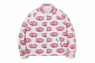 中でも目を引くのは、両ブランド名を合わせたコラボネームロゴを全体にあしらった総柄のハリントンジャケット。ヴィンテージジャケットをモチーフに、着古したようなナチュラルな風合いに仕上げた。