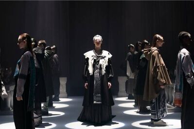 柱を設置し裁判所に見立てたホールで、法服をイメージした黒いドレスのファーストルック入場からショーがスタート。ドレスには、コレクションの随所で散見される価値の象徴のモチーフ“正義の女神ユースティティア”がプリントされている。セカンドルックからは「洋服の真の価値」を体現するように、2着ずつ対になったウェアたちが続々と登場。一見同じように見えるが、異なる素材を使用したウェアたちを対比しているのが特徴だ。