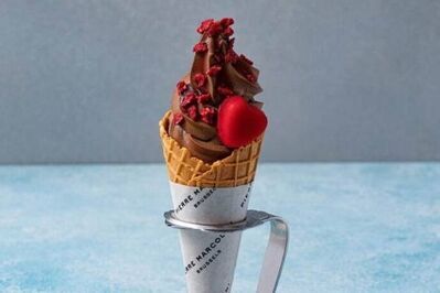 ベスト1に選ばれたのは、グランスタ東京にあるピエール マルコリーニ(Pierre Marcolini)の「ソフトクリーム フランボワーズ」。一口目からまるで生チョコレートを食べているような感覚を楽しめる、濃厚チョコレートソフトクリームだ。甘酸っぱいフランボワーズソースとフリーズドライの果肉が、ショコラの奥深い味わいをよりいっそう際立たせる。