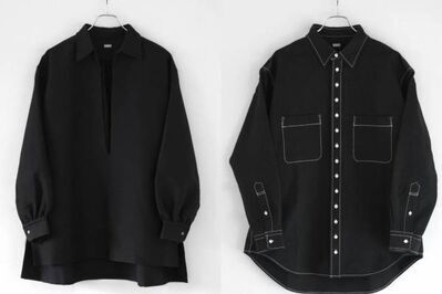 起毛感のある上質なウールシルクで仕立てたブラックのプルオーバーシャツは、襟からフロントにかけて深く開いたデザインと、背面にふんわりと効かせたギャザーの立体感が魅力。緩やかなドレープが、エレガントな雰囲気とともに程よいリラックス感も演出してくれる。襟が開くフォルムのため、タートルネックシャツやクルーネックカットソーなど、合わせるインナーによって異なる雰囲気を楽しめる。