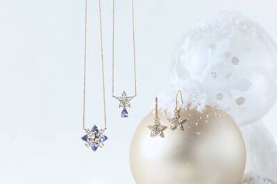 「ベルフラワー」の異名を持つ桔梗の花をモチーフにデザインされた新シリーズには、ネックレス2種とピアスがラインナップ。タンザナイトで表現された気品あふれる青紫色と澄んだホワイトトパーズのカラーコントラストを用いることで、星形の花びらを象った華やかなデザインながら知的で落ち着いた雰囲気に仕上がっている。