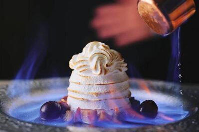 京都北山 マールブランシュ「燃える氷山 ベイクドアラスカ」青い炎が包み込む、創業当時の人気メニュー