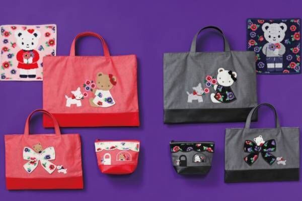 ピンクやレッドを基調としたアイテムを組み合わせた。ピンクカラーのハンカチ、アイボリーのアップリケを施したレッドのデニムバッグとブック入れ、ポーチが展開される。