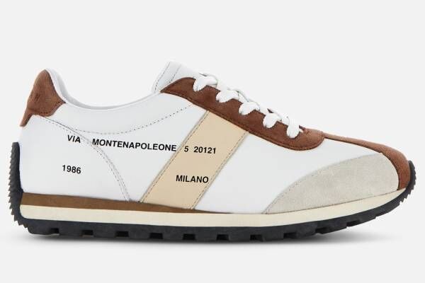 2024-25年秋冬コレクションは、ホーガンのアーカイブシューズや、ブランドの創業地であるイタリアなどが着想源。カーフレザーに、使用感のある風合いをもたらすストーンウォッシュ加工を施したスニーカーでは、ホーガンの創業年である“1986”の数字や“MILANO”の文字をあしらっている。