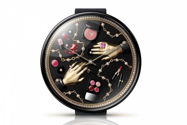 腕時計「マドモアゼル プリヴェ ピンクッション ビューティー アート」は、マドモアゼル自身の手元を写した写真から着想。文字盤には、リップスティックやアイシャドウパレット、ネイルポリッシュ、チークなど、ピンクを基調にしたメイクアップアイテムを職人の手作業により製作。小さな芸術ともいえるダイヤルの美しさが特徴となっている。