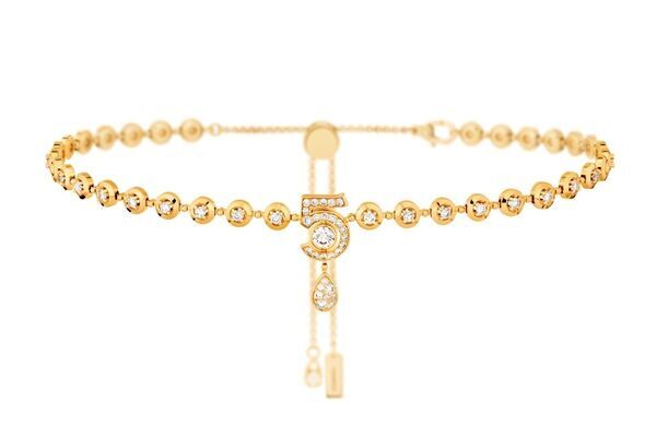 ネックレスは、「5」の数字の中央に煌めく0.3カラットのクローズドセッティング ダイヤモンドを添え、その下で香水の雫モチーフが揺れるのがポイント。長さの調整が可能なので、ショートネックレスもしくはチョーカーの2つのスタイルを楽しめるのも嬉しい。