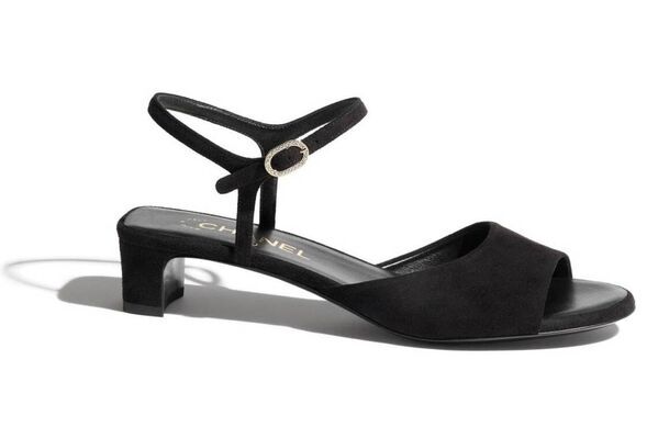 夏の足元を上品に演出するブラックのストラップサンダルは、アッパーやストラップににマットなキッド スエードを採用。きらめくバックルが華やかなアクセントをもたらしている。
