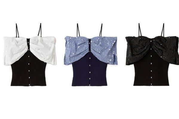 大胆なリボンモチーフを表現した「BIGリボンビジューニットトップス」は、肩紐を通さず、オフショルダースタイルでも楽しめる2WAY仕様。肩回りを彩る大胆なリボンにたっぷりのビジューをあしらい、華やかなムードを演出した。