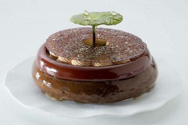フランス語で「池のほとりにて」を意味する「オ・ボール・ド・レタン」。その名の通り、円筒型をしたケーキの中央には、飴細工でしたたる雫まで見事に表現された蓮の葉が一輪咲いている。ユニークで美しい見た目で、少し特別なバレンタインを過ごすのにもぴったりのケーキだ。