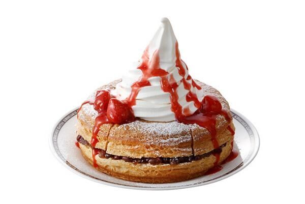 ほかほかの自社製デニッシュパンに、北海道産の小豆を炊いたコメダ特製の小倉あんをはさみこみ、冷たいソフトクリームとイチゴソースをかけた。小豆の優しい甘さと甘酸っぱいイチゴソースの上品なハーモニーが口いっぱいに広がる一品となっている。