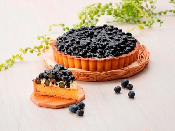 収穫最盛期の瑞々しい信州ブルーベリーは、各店舗自慢のタルトで。「チーズケーキング エフ」や「パティスリー