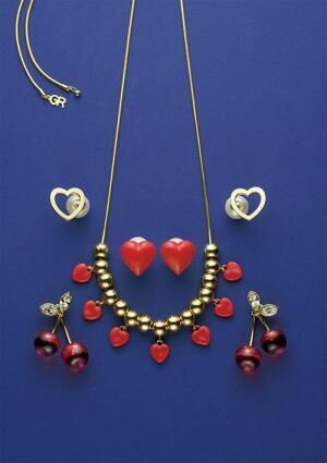 プレフォールのテーマは「SNOB PREPPY」。どこか懐かしいレトロでプレッピーな雰囲気を纏わせた。ネックレスは、真っ赤なハートとゴールドの色合わせ。同じく赤いハートを主役にしたイアリングとピアスは、パールを添えたポップなデザインだ。また、ハート型に縁取られたゴールドのイアリングとピアスは、前から見るとハート、後ろから見るとパールが輝く。