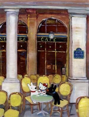 「リサとガスパール」がキャラクターとコラボーレションするのも、山口裕子が油絵で「ハローキティ」を描くのも今回が初の試み。両者はパリと南仏を制作拠点とし、ハローキティ、リサ、ガスパールがパリのカフェで佇んだり、ブーランジェリー(パン屋)で買い物をしたりする様子を描いた7点を完成させている。