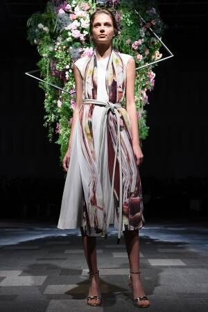 そして、次にふたつめのシーン。抽象的なグラフィック柄が投影される。リアルな花を銅板に写して、それをまるごと用いたという花柄は幻想的かつ魅惑的な印象を受ける。軽快な素材を用いているからか、さらに花という存在が現実的でなくなっている。一見、何模様か戸惑うほどの色柄が入り混じるテキスタイルは、よく見れば確かに花が咲き誇っている。