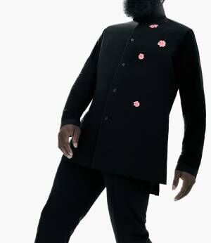 黒一色のアパレルアイテムには、牡丹の花が鮮やかな差し色をプラス。光沢感のあるオーバーサイズのフライトジャケットや、端正に仕立てたシャツ、クロップトパンツが揃う。