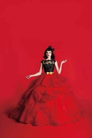 「ミッキーマウス」をモチーフにした3種類のドレス。注目はミッキーカラーである赤・黒・黄の3色取り入れてモダンに表現したドレスだ。インパクトのある配色であるが、ランダムに動きのでるティアード風に仕上げることでバランスを調整。トップスには小花柄のコード入リバーレースを取り入れている。
