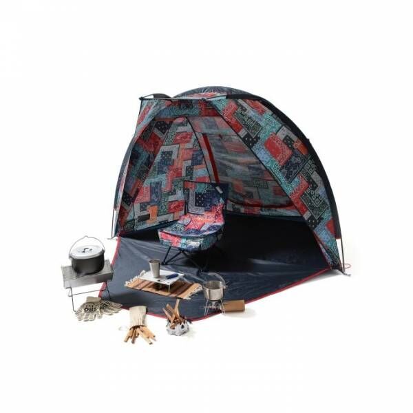 レッドやブルー、オレンジなど、様々な色彩をベースにしたバンダナをパッチワーク風にデザイン。フェス会場や海で活躍するチェアやレジャーシートなどを鮮やかに彩っている。また今季は、アウトドアワゴンとビーチシェードがラインナップに加わり全5型での展開となる。
