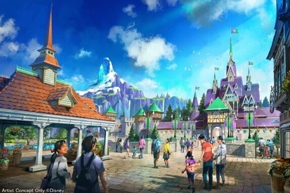 『アナと雪の女王』を舞台とする「フローズンキングダム」に広がるのは、雪の女王であるエルサが氷の魔法を受け入れ、映画が幕を閉じた後の世界。ゲストは、暖かさを取り戻して祝福ムードに包まれたアレンデール王国の世界を楽しむことができる。村の奥には滝の流れる山々がそびえ立ち、遠くに見えるノースマウンテンの山頂付近には、エルサの氷の宮殿が輝く。