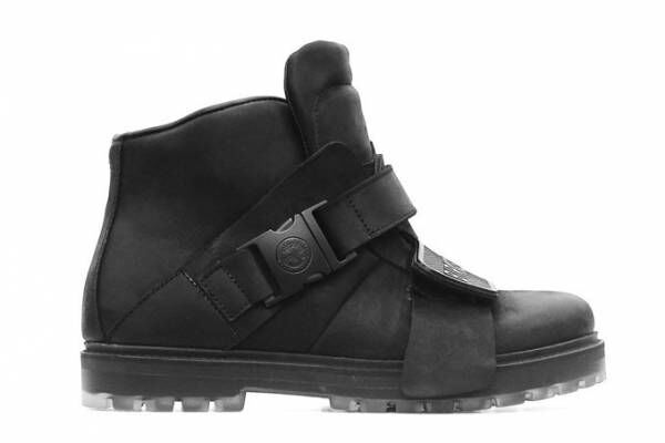 ベースには、「Rotterdam」のベルクロサンダルと「Rotterhiker」のブーツを採用。「Rotterhiker」は、ブラックのオイルドヌバックレザーを配したベロア素材のアッパーと、半透明のラバーソール「BIRKENSTOCK フットベッド」で構築。簡単に着脱できるようバックルが付いたアッパーストラップをあしらった。