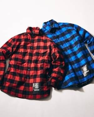 マインデニム(MINEDENIM)を手掛けるスタイリストの野口強は、アウターとしても着用可能なチェック柄のネルシャツダウンをデザイン。カラーはネイビー、レッド、ブラックの3色を用意する。さらに、スウェットフーディも展開される。