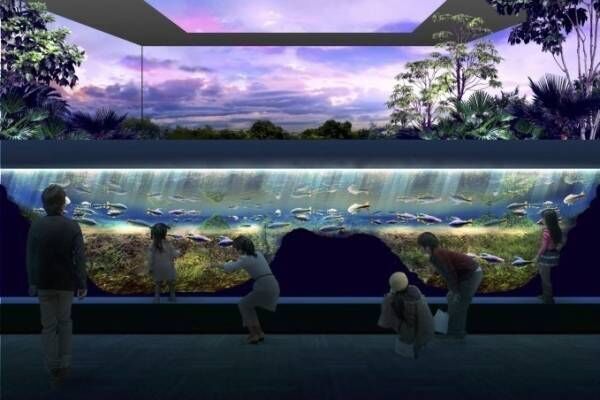 水槽はコの字型に設計することで、様々な角度から魚たちを鑑賞できるように工夫。“アクアスケープ水槽”という展示手法により、手前に水槽、後方に南米・アマゾン川流域の映像を映すモニター、その間に植栽を配した。朝、昼、夜と異なった映像と照明演出が実施され、時間帯によって異なる景色を楽しめるのもポイントだ。