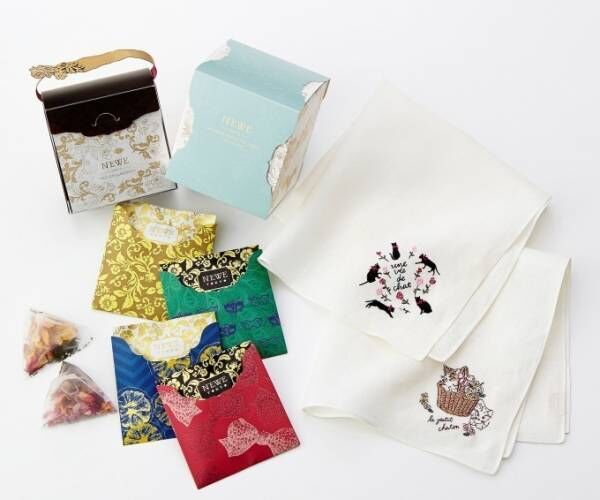華やかなパッケージに包まれた「NEWE」の緑茶やハーブのブレンド茶のティーパックのギフトセット。それぞれ個包装されており、1個からも購入が可能だ。「リネンラヴィ」の猫モチーフの刺繍が入った麻100%ハンカチなどと一緒に贈るのも良いだろう。
