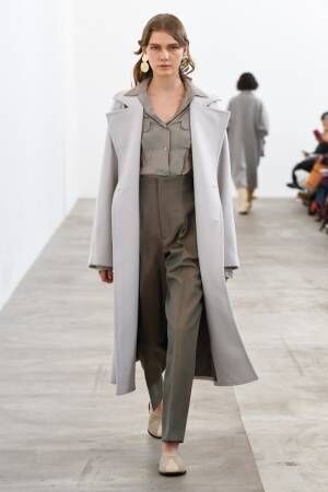 現代的でありながらナチュラルなムードを再現するのに一役買っているのはファブリックだろう。たとえばオーバーサイズのシャツやロングスカートに採用されたウールストライプのテキスタイルは、リネンを織り込むことで素朴な風合いを引き出している。