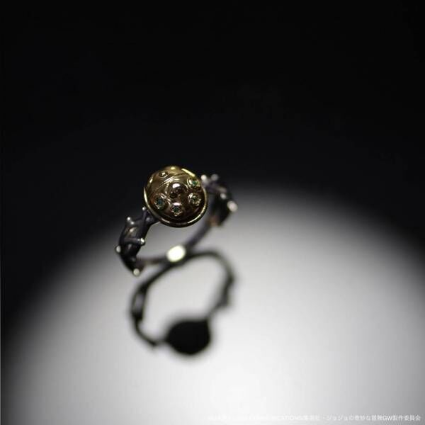 中でも注目は、主人公「ジョルノ・ジョバァーナ」のゴールド・エクスペリエンスの能力を、テントウムシと植物の蔦で表現したシルバーリングだ。テントウムシの部分にゴールドコーティングをあしらい、4つの天然エメラルドを石留めした。ジョルノ・ジョバァーナのブローチをリングで再現したファン垂涎のアイテムとなっている。