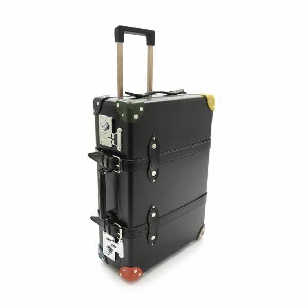 コラボレーショントラベルケースは、グローブ・トロッターを象徴する「ヴァルカン・ファイバー」をボディーに採用。ブラックのケースの角を覆うコーナーレザーには、ポール・スミスの「シグネチャーストライプ」から着想を得たネイビー、トープ、ライムイエロー、セージ、バーントオレンジ、ピーコック、バーガンディー、ブライトレッドの8色が施されている。