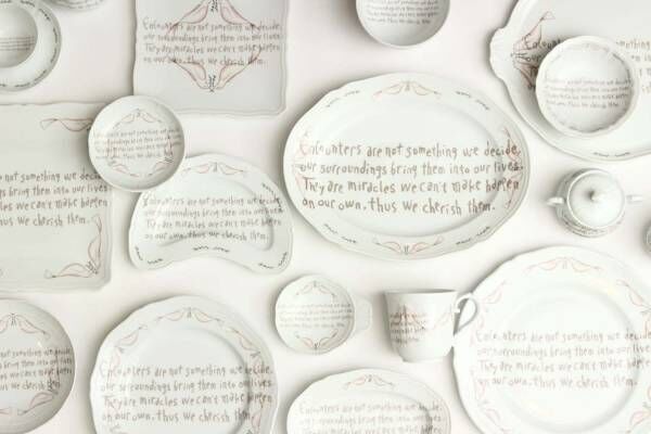 日本の厳しい製品基準をクリアできなかった器をキャンバスに、それぞれのモチーフからイメージされる景色やストーリーを皆川が言葉に変え、手書きで綴ったテキストをオーバープリントした。
