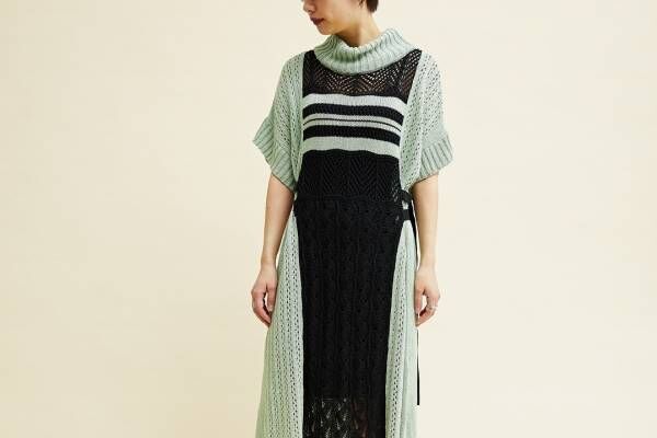 ミッドウエストの別注では、ニットで仕上げた新作ドレスとスカートを、爽やかなグリーンカラーでアレンジ。ハーフスリーブで仕上げたロング丈のドレスは、フロントにブラックのニットで切り替えを施した。ゆったりしたシルエットながらも、サイドベルトを絞ることで好みのスタイルで着こなすことができる。