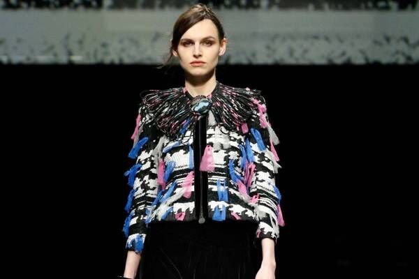 今シーズンのテーマは「VELVET NOTES」。メインマテリアルにブラックのベルベットを据え、纏う人個々の美しさを引き出すようなピースを展開していく。アイテムは、美しい光沢によって身体の動きを強調するベルベットの特性を生かしたもの。たとえばジャケットは力強いショルダーラインを主軸にボディラインになめらかに寄り添うようなシルエットで、モデルが歩くたびにベルベットが上品な輝きを放つ。