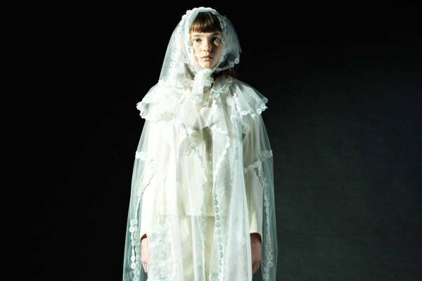 「甘いテイストを意識した」と語るデザイナー 宮尾史郎の言葉通り、今シーズンは洋服の随所にロマンティックなムードが感じられる。その象徴となるのは、刺繍やプリント、ブレードとして登場した様々なフラワーモチーフ。中でも小花で縁どったチュール素材のアイテムは、まるでウェディングドレスの“ベール”のような、ピュアな表情が印象的だ。トレンチコートやブラウスといったクラシカルなピースに、アウターとして重ねることでドレッシーなムードへと導いてる。