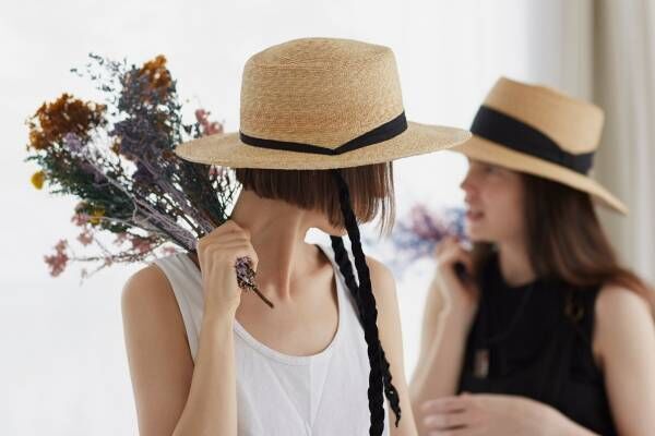 ハットの種類は8種類。深めのクラウンに、7.5cmの太いグログランリボンを取り付けたシックなものから、天然素材のバオ(ヤシの木)を使用したハット、緩やかな傾斜と丸みのあるトップが特徴的なセーラーハット、ストローブレードを使用したロールキャップなどが展開される。