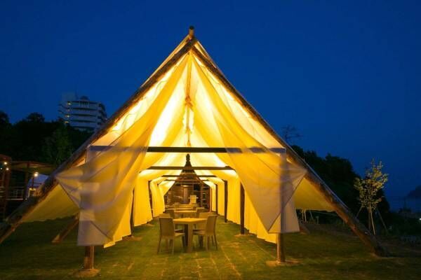 同施設では全部で15棟を用意し、一棟一棟に広く使えるプライベートな空間が提供される。また、グランピングテントは、丸いフォルムで開放感抜群の繭型テントや、天蓋付きのベッドとラグジュアリーな室内が特徴のオリジナルテントなど、日本初登場のテントを含む、全4種類の展開となる。