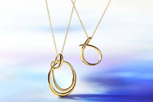 躍動感のある水の流れをイメージした、イエローゴールドのネックレスやピアスは、ダイナミックな曲線を描くフォルムが魅力。360度どこから見ても美しく見えるよう計算された、ボリュームのあるデザインによって、水の力強さを表現している。