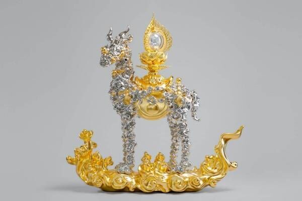 そんな名和晃平の個展「Oracle」では、複数のメディウムや塗料・オイル・油絵具などを混合し複雑なテクスチャーで表現したペインティング、UVレーザーを用いた新作を展示。また、メインの展示作品として、鎌倉時代の彫刻作品『春日神鹿舎利厨子』へのオマージュとなる木彫漆箔仕上げの新作『Trans-Sacred Deer (g/p_cloud_agyo)』、通称『雲鹿』を発表する。