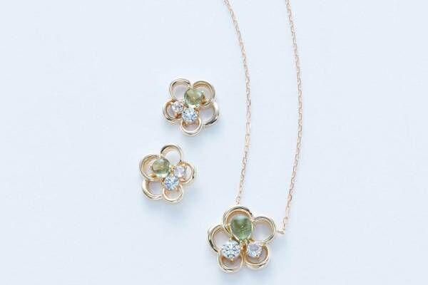 爽やかなミントの香りを持つ「アロマティカス」をイメージしたネックレスやピアスは、ミントカラーの天然石・ペリドットで、芳醇で奥深い香りを詩的に描き出した。5つの花びらを持つフラワーモチーフの上には、ブルー ムーンストーンも添えて。小ぶりなデザインなので、セット使いしても上品な印象を演出できる。アロマティカスの花言葉は「友情」だ。