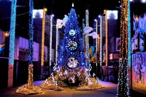 ひらかたパークのイルミネーション「光の遊園地」巨大ツリーや上空に浮かぶ約500灯のランタンなど