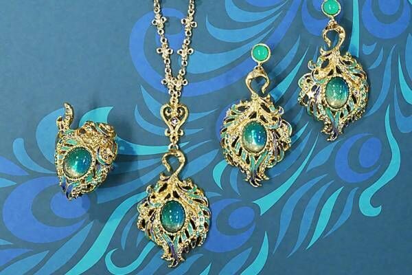 ジュエリーの主役となる孔雀の羽根は、愛や美の象徴であるだけでなく、古来から“魔よけ”アイテムとして親しまれてきたラッキーモチーフ。展開されるリング、ネックレス、イヤリング(ピアス)は、そんな孔雀の羽根を、鮮やかなブルーグリーン×煌めくイエローゴールドで、エキゾチックに表現しているのが特徴だ。