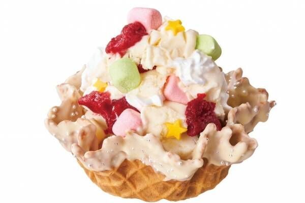 「トゥインクル ギフト バスケット」は、 “真っ白な冬空にきらめく星々”を表現したアイスクリーム。まろやかなチーズケーキアイスクリームと、甘酸っぱいラズベリー&クランベリージェラートの2種類のアイスクリームを組み合わせ、ふわっとした食感のパステルカラーマシュマロを飾った。ホワイトチョコレートとアラザンを使用した限定ワッフル「トゥインクル ワッフルボール」もポイントだ。